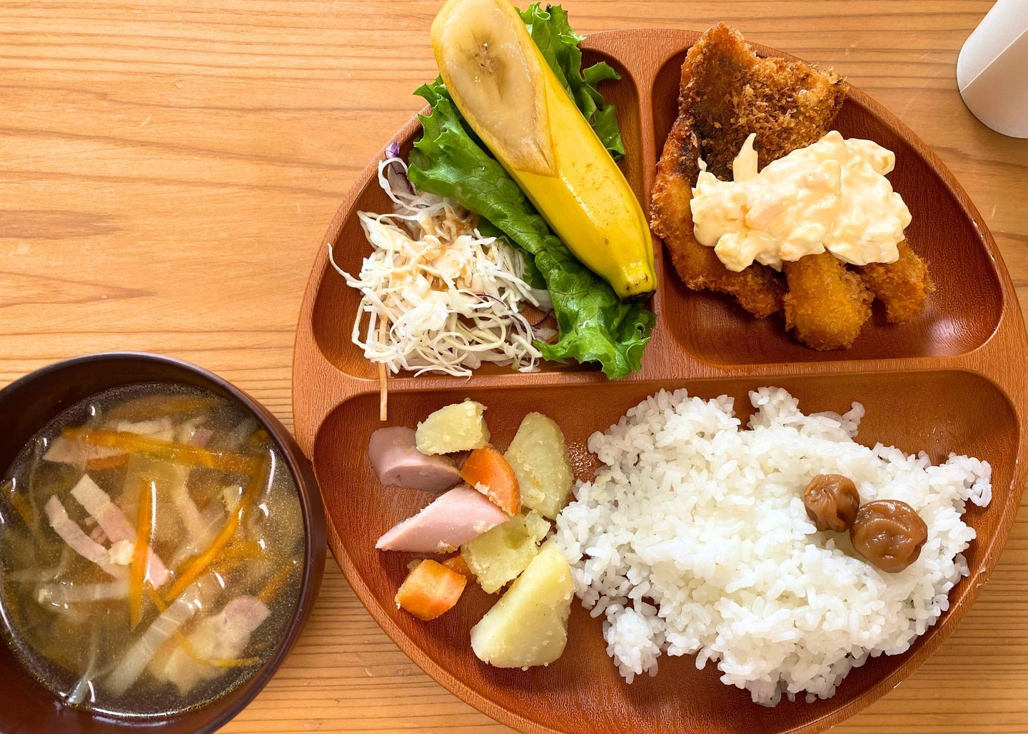 毎朝、居酒屋オーナーのママさんが作りに来てくれて、和洋折衷さまざまなメニューが日替わりで楽しめます。